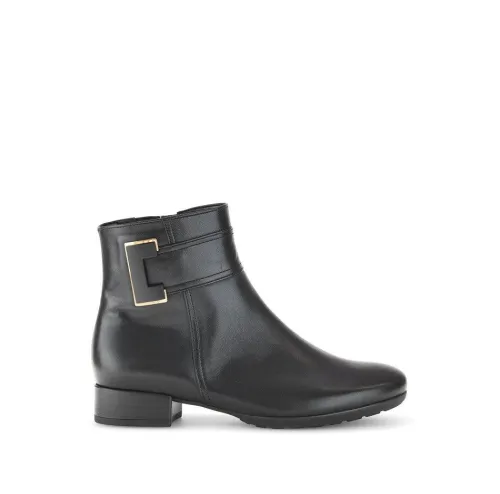 Korte laars van Gabor in zwart leer op de wijdte H op de leest Pisa. Aan de binnenzijde zit een rits waardoor die makkelijk is aan en uit te trekken. Aan de buitenzijde zit een siergesp. De laars heeft een lage hak en een uitneembaar voetbed. ||Gabor is een Duits fabricaat, met diverse leesten en wijdtematen. Ze staan bekend om hun goede leesten en zachte leersoorten. Modisch comfortabel tegen betaalbare prijzen. Sommige hebben een uitneembaar voetbed.