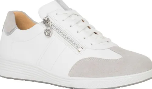 Sneaker van Ganter met een veter te verstellen in wit leer met licht grijs suede. Gemaakt op een extra brede K wijdte op de leest Klara. Aan de zijkant zit een rits, waardoor die makkelijk is aan en uit te trekken. De voetbedden zijn uitneembaar. ||Ganter is een Duits fabricaat, met diverse leesten en wijdtematen. Zij hebben pasvorm, natuur en milieu hoog in het vaandel. Ze maken tijdloze schoenen en gebruiken daarbij materialen die zo min mogelijk het milieu belasten. Zoals plantaardig gelooid leer, kurken voetbedden tot aan papier uit duurzame bosbouw. Ganter koopt u online bij ruttenschoenen.nl