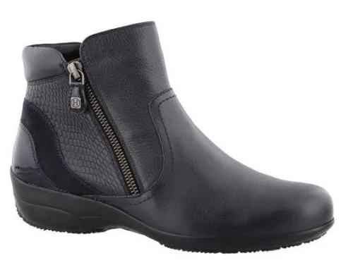 Korte laars van Helioform met 2 ritsen in blauw leer met suede en sierprint. Door de 2 ritsen is het inschot ruimer en zijn ze makkelijk uit en aan te trekken. Gemaakt op een brede H wijdte met een bijna platte hak en een TPU zool. De voetbedden zijn uitneembaar en ze zijn dus geschikt voor eigen steunzool. ||Helioform is een Nederlands fabrikaat in een populaire prijsklasse, de schoenen worden in Nederland ontworpen en tegenwoordig onder streng toezicht voor goede arbeidsomstandigheden in India gemaakt. Ze maken verschillende wijdtematen en meestal zijn ze geschikt voor eigen steunzool.