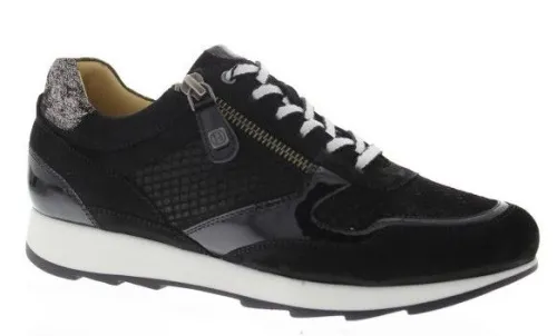 Sneaker van Helioform, met een rits aan de zijkant in zwart suede met een lak inzet in combinatie met een grijze fantasieprint bij de hiel. Rond de enkel is de schoen gepolsterd. De schoen is er op een brede H wijdte op de leest 240 en heeft een bijna platte hak van ca 20 mm. De voetbedden zijn uitneembaar en ze zijn dus geschikt voor eigen steunzool. ||Helioform is een Nederlands fabrikaat in een populaire prijsklasse, de schoenen worden in Nederland ontworpen en tegenwoordig onder streng toezicht voor goede arbeidsomstandigheden in India gemaakt. Ze maken verschillende wijdtematen en meestal zijn ze geschikt voor eigen steunzool. Helioform koopt u online bij Ruttenschoenen.nl