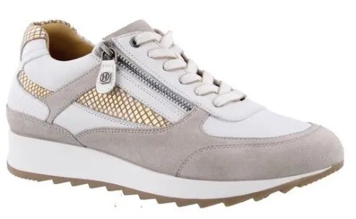 Sneaker van Helioform, met een rits aan de zijkant in beige suede met wit leer Gecombineerd met een goud kleurige inzet. Rond de enkel is de schoen gepolsterd. De schoen heeft een stevige zool en is gemaakt op een extra brede K wijdte op de leest 250. De voetbedden zijn uitneembaar en ze zijn dus geschikt voor eigen steunzool. ||Helioform is een Nederlands fabrikaat in een populaire prijsklasse, de schoenen worden in Nederland ontworpen en tegenwoordig onder streng toezicht voor goede arbeidsomstandigheden in India gemaakt. Ze maken verschillende wijdtematen en meestal zijn ze geschikt voor eigen steunzool. Helioform koopt u online bij Ruttenschoenen.nl