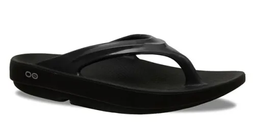 Oofos teenslipper in het zwart. ||Oofos reduceert stress op voeten gewrichten en onderrug. Je voeten en gewrichten hebben het zwaar op een harde ondergrond. Stap in een paar OOfos na een training of vermoeiende dag op je voeten, dit resulteert in minder stress op je voeten, gewrichten en onderrug. OOfos helpt je lichaam en geest sneller te herstellen. OOfos, biomechanisch ontworpen, beweegt mee met zowel je voet als de grond. Het zachte, flexibele OOfoam materiaal zorgt voor een natuurlijke afwikkeling van de voet. Het gepatenteerde OOfos voetbed zo ontworpen dat de voetboog perfect ondersteund wordt. Op deze manier wordt de druk op voeten, gewrichten en onderrug verlicht. Een sneller herstel met Oofos Recovery Footwear. Na een sportieve inspanning of vermoeiende dag op je voeten verdienen je voeten rust om de volgende dag er weer tegen aan te kunnen. OOfos is ontworpen je voeten, gewrichten en onderrug sneller te helpen herstellen. Ervaar het zelf.  Zacht teenstuk voor extra comfort  Duurzaam OOfoam blijft demping houden  Verlicht pijn bij hielspoor  Douche- en waterbestendig; Vocht- en bacterie werend; neemt geen nare geurtjes op  Zo licht dat ze drijven