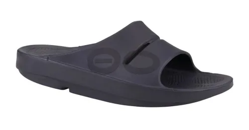 Oofos slipper in het zwart. ||Oofos reduceert stress op voeten gewrichten en onderrug. Je voeten en gewrichten hebben het zwaar op een harde ondergrond. Stap in een paar OOfos na een training of vermoeiende dag op je voeten, dit resulteert in minder stress op je voeten, gewrichten en onderrug. OOfos helpt je lichaam en geest sneller te herstellen. OOfos, biomechanisch ontworpen, beweegt mee met zowel je voet als de grond. Het zachte, flexibele OOfoam materiaal zorgt voor een natuurlijke afwikkeling van de voet. Het gepatenteerde OOfos voetbed is zo ontworpen dat de voetboog perfect ondersteund wordt. Op deze manier wordt de druk op voeten, gewrichten en onderrug verlicht. Een sneller herstel met Oofos Recovery Footwear. Na een sportieve inspanning of vermoeiende dag op je voeten verdienen je voeten rust om de volgende dag er weer tegen aan te kunnen. OOfos is ontworpen je voeten, gewrichten en onderrug sneller te helpen herstellen. Ervaar het zelf. . Zacht teenstuk voor extra comfort . Duurzaam OOfoam blijft demping houden . Verlicht pijn bij hielspoor . Douche- en waterbestendig; Vocht- en bacterie werend; neemt geen nare geurtjes op . Zo licht dat ze drijven ||De maten zijn unisex, dus voor dames en heren.