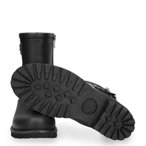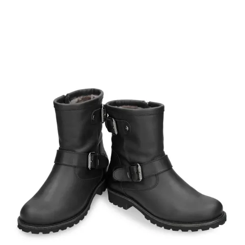 Korte laars van Panama Jack in zwart gevet leer met een stevige rubberzool. Heeft een uitneembaar voetbed en is dus geschikt voor eigen steunzool. De laars heeft een lamsvacht voering, dus heerlijk warm en niet broeierig. Aan de zijkant zitten 2 siergespen. De hak is bijna plat ca 20 mm. ||Panama Jack is ontstaan in 1989 aan de mediterrane kust. Antonio Vincente, de ontdekker, die altijd de drang heeft een stap verder te gaan dan anderen, hanteerde de principes. 1 De Panama Jack klant is niet afhankelijk van leeftijd of sociale status, maar van houding en manier van denken. 2 Het plezier van lopen, de natuurlijke stijl en het zoeken van dagelijks avontuur staan voorop. 3 het product moet in behoeftes voorzien. Gebaseerd op het concept om iets anders te maken, een nieuwe horizon te ontdekken, het concept van lekker lopen. Zo startte het avontuur van Panama Jack.