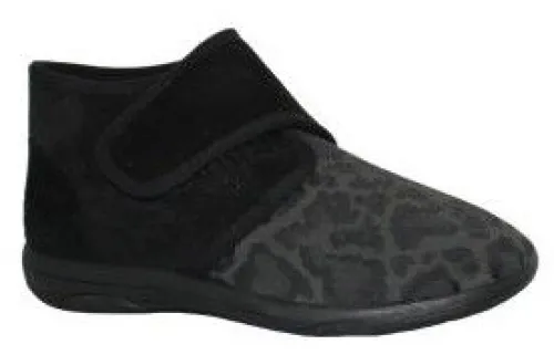 Verbandschoen/pantoffel van Promed met glad voorblad en leerlook vanachter. Het voorblad heeft een panterprint en is van een zacht stretch elastaan, wat prettig is met bijna alle probleemvoeten zoals hallux valgus, hamertenen, artrose en gezwollen voeten. Ideaal voor mensen met reuma in de voeten. De pantoffel/schoen heeft een doorlopende antislipzool met schokdemping en neuropathiezone. Bij de enkel is die te verstellen met klittenband. De pantoffel is bijzonder geschikt voor drukgevoelige voeten. De voetbedden zijn uitneembaar, dus ook te dragen met eigen steunzolen. Ze zijn uitwasbaar. ||Promed is 16 jaar geleden samen met hun Duitse partner met veel zorg een ontwikkelingssamenwerking aangegaan, waarbij zij geadviseerd werden door specialisten en orthopedische bedrijven. Hieruit is een assortiment van verbandschoenen van de hoogste kwaliteit voorgekomen. Deze verbandschoenen bieden hulp en bevorderen de genezing van uw voet bij opgezwollen en ingezwachtelde voeten, oedeem, huiddefecten en ontstekingen of circulatie stoornissen. Bieden ook verlichting bij herstel van een gedeeltelijke amputatie, trauma of een operatieve ingreep aan uw voet.