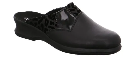 Dames pantoffelslipper van Rohde in zwart leer met een lakstukje en een leopard print. De slipper heeft een ingebouwd voetbed. De hak is laag ca 3 cm. ||Rohde is van oorsprong een Duitse firma en inmiddels overgenomen door een Italiaan. Rohde wordt hoofdzakelijk in de aziatische landen gefabriceerd.