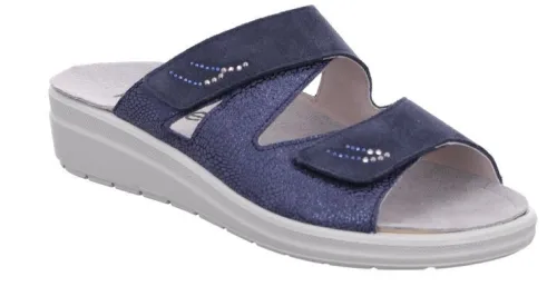 Slipper van Rohde met 2 klittenbanden te verstellen in blauw suede met nubuck in combinatie met een fantasieprint. Op een ca G wijdte. Het zijn comfortabele slippers. De hak is ca 20 mm hoog en de voetbedden zijn uitneembaar en dus geschikt voor eigen steunzool. ||Rohde is van Duitse oorsprong en inmiddels in Italiaanse handen, die het merk een nieuw elan heeft gegeven. Het meeste wordt in Europa gefabriceerd.