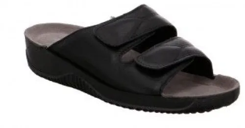 Slipper van Rohde met 2 klittenbanden te verstellen in zwart gepolsterd leer. Op een G wijdte. Het zijn comfortabele slippers. De hak is ca 20 mm hoog en de voetbedden zijn niet uitneembaar. ||Rohde is van Duitse oorsprong en inmiddels in Italiaanse handen, die het merk een nieuw elan heeft gegeven. Het meeste wordt in Europa gefabriceerd.