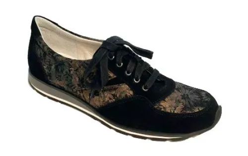 Sneaker van schneider op een smalle wijdte C in zwart nubuck in combinatie met bruin en een fantasy print. De voetbedden zijn dun en wat moeilijker eruit te halen. Dus alleen geschikt voor een dunne steunzool. Doordat deze leest echt smal is, heb je er vaak een hele maat groter van nodig. Dit geldt niet als u bekend bent met Schneider. ||Schneider is een specialistisch Zwitsers merk wat zich heeft gericht op de smalle voet. Ze gebruiken mooie leermaterialen en zijn voor mensen met hele smalle voeten een uitkomst.