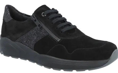 Sneaker van Solidus op een smalle F wijdte op de leest Hills in zwart suede met aan de zij en achterkant een sierprint. Aan de zijkant zit een rits waardoor als de veter eenmaal gesteld is de schoen makkelijk aan en uit te trekken is. De dikkere chunky zool maakt het een sneaker helemaal van deze tijd. De voetbedden zijn uitneembaar en de schoen is dus geschikt voor uw eigen steunzool. ||Solidus is een Duits fabricaat, met diverse leesten en wijdtematen, van smal tot super breed. Ze gebruiken zachte leersoorten, waardoor ze vaak zeer comfortabel en geschikt voor gevoelige voeten zijn. Voor de zeer gevoelige en of diabete voet, maken ze ook nog een speciale collectie “Solicare” Veel leesten en artikelen komen vaak weer terug, veelal in een andere uitvoering. Solidus koopt u online bij Ruttenschoenen.nl