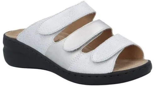 Slippers van Solidus met 3 klittenbanden te verstellen in wit leer met suede en lak. Gemaakt op een brede H wijdte op de leest Special met een wat hogere stabiele hak van ca 30 mm hoog. De voetbedden zijn uitneembaar en ze zijn dus geschikt voor uw eigen steunzool. ||Solidus is een Duits fabrikaat, met diverse leesten en wijdtematen. gemaakt uit zachte leersoorten. Veel leesten en artikelen komen vaak weer terug, veelal in een andere uitvoering.