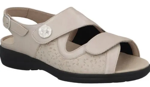 Sandaal van Solidus met 2 klittenbanden en van achter een drukknop die te verstellen is in beige leer en met stretch aan de zijkant. Gemaakt op een brede H wijdte op de leest Lia met een bijna platte hak van ca 25 mm hoog. De voetbedden zijn uitneembaar en ze zijn dus geschikt voor uw eigen steunzool. || Solidus is een Duits fabricaat, met diverse leesten en wijdtematen, van smal tot super breed. Ze gebruiken zachte leersoorten, waardoor ze vaak zeer comfortabel en geschikt voor gevoelige voeten zijn. Voor de zeer gevoelige en of diabete voet, maken ze ook nog een speciale collectie “Solicare” Veel leesten en artikelen komen vaak weer terug, veelal in een andere uitvoering. Solidus koopt u online bij Ruttenschoenen.nl