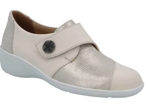 Klittenband schoen van Solidus, verstelbaar met klittenband in beige leer in combinatie met een fijne print. De schoen heeft een lage hak ca 25 mm. Geschikt voor uw eigen steunzool op een brede J wijdte, op de leest Hedda. Deze leest is met name geschikt voor een knokige voet. ||Solidus is een Duits fabricaat, met diverse leesten en wijdtematen, van smal tot super breed. Ze gebruiken zachte leersoorten, waardoor ze vaak zeer comfortabel en geschikt voor gevoelige voeten zijn. Voor de zeer gevoelige en of diabete voet, maken ze ook nog een speciale collectie “Solicare” Veel leesten en artikelen komen vaak weer terug, veelal in een andere uitvoering. Solidus koopt u off en online bij Ruttenschoenen.nl
