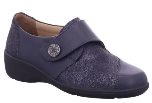 Klittenband schoen van Solidus, verstelbaar met klittenband in blauw leer met een fijne fantasie print. De schoen heeft een lage hak van ca 25 mm. Geschikt voor uw eigen steunzool op een J wijdte, op de leest Hedda. Deze leest heeft een gebroken wijdte dus smaller in de hielpartij en breder bij de bal van de voet en is met name geschikt voor een knokige voet. ||Solidus is een Duits fabricaat, met diverse leesten en wijdtematen, van smal tot super breed. Ze gebruiken zachte leersoorten, waardoor ze vaak zeer comfortabel en geschikt voor gevoelige voeten zijn. Vor de zeer gevoelige en of diabete voet, maken ze ook nog een speciale collectie “Solicare” Veel leesten en artikelen komen vaak weer terug, veelal in een andere uitvoering.
