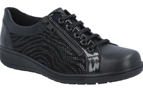 Sneaker van Solidus verstelbaar met een veter in zwart leer met suede en lak. Aan de zijkant zit een rits waardoor die makkelijk is aan en uit te trekken. Op een lage hak van ca 25 mm. Geschikt voor uw eigen steunzool op een extra brede K wijdte, op de leest Kate. ||Solidus is een Duits fabricaat, met diverse leesten en wijdtematen, van smal tot super breed. Ze gebruiken zachte leersoorten, waardoor ze vaak zeer comfortabel en geschikt voor gevoelige voeten zijn. Vor de zeer gevoelige en of diabete voet, maken ze ook nog een speciale collectie “Solicare” Veel leesten en artikelen komen vaak weer terug, veelal in een andere uitvoering. Solidus koopt u off en online bij Ruttenschoenen.nl