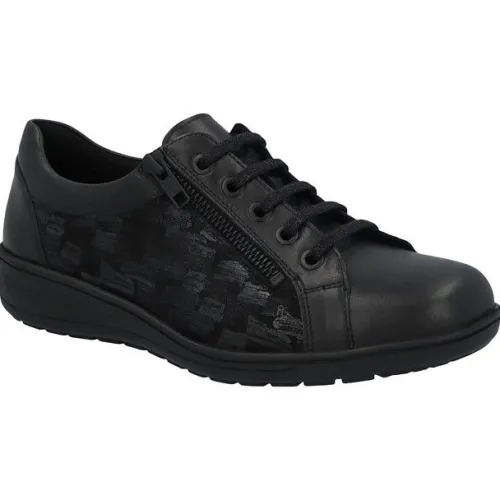 Sneaker van Solidus verstelbaar met een veter in zwart leer en een nubuck print aan de zijkant. Aan de zijkant zit een rits waardoor die makkelijk is aan en uit te trekken. Op een lage hak van ca 25 mm. Geschikt voor uw eigen steunzool op een extra brede K wijdte, op de leest Kate. ||Solidus is een Duits fabricaat, met diverse leesten en wijdtematen, van smal tot super breed. Ze gebruiken zachte leersoorten, waardoor ze vaak zeer comfortabel en geschikt voor gevoelige voeten zijn. Vor de zeer gevoelige en of diabete voet, maken ze ook nog een speciale collectie “Solicare” Veel leesten en artikelen komen vaak weer terug, veelal in een andere uitvoering. Solidus koopt u off en online bij Ruttenschoenen.nl