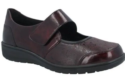 Bandschoen van Solidus met een klittenband te verstellen in bordeaux lak met een zachte stretchstof met een fantasie print. Gemaakt op een extra brede K wijdte op de leest Kate met een bijna platte sleehak van ca 20 mm hoog. Deze schoen heeft veel ruimte bij de tenen en is met name geschikt voor een gevoelige voet. De voetbedden zijn uitneembaar en ze ijn dus geschikt voor uw eigen steunzool. ||Solidus is een Duits fabrikaat, met diverse leesten en wijdtematen. gemaakt uit zachte leersoorten. Veel leesten en artikelen komen vaak weer terug, veelal in een andere uitvoering. Solidus koopt u online bij Ruttenschoenen.nl