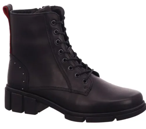 Biker boot van Solidus met veter te verstellen in zwart leer met aan de achterlip rood leer. Bij de hiel zitten studs. Aan de zijkant zit een rits waardoor als de boot eenmaal gesteld is die makkelijk aan en uit te trekken is. Het nieuwe grove onderwerk met maakt de boot helemaal van deze tijd. Gemaakt op een extra brede K wijdte op de leest Kibu. De voetbedden zijn uitneembaar en de boot is dus geschikt voor uw eigen steunzool. ||Solidus is een Duits fabricaat, met diverse leesten en wijdtematen, van smal tot super breed. Ze gebruiken zachte leersoorten, waardoor ze vaak zeer comfortabel en geschikt voor gevoelige voeten zijn. Voor de zeer gevoelige en of diabete voet, maken ze ook nog een speciale collectie “Solicare” Veel leesten en artikelen komen vaak weer terug, veelal in een andere uitvoering. Solidus koopt u online bij Ruttenschoenen.nl