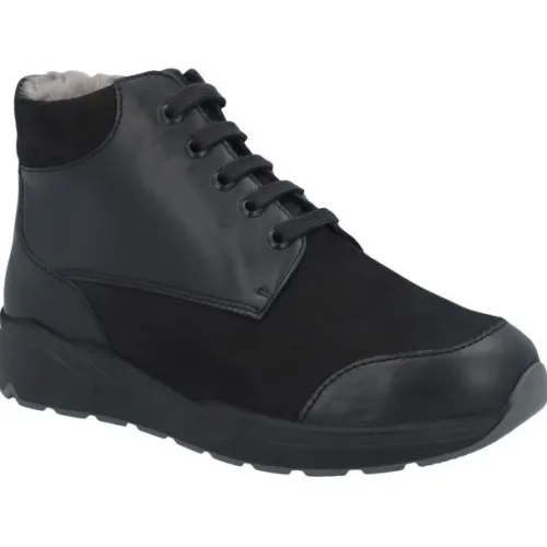 Boot van Solidus in zwart leer met suede en met lamsvacht gevoerd op een super brede M wijdte op de leest Mia. Deze boot is verstelbaar met een veter en heeft aan de binnenzijde een rits. Geschikt voor uw eigen steunzool door het voetbed dat uitneembaar is. ||Solidus is een Duits fabricaat, met diverse leesten en wijdtematen, van smal tot super breed. Ze gebruiken zachte leersoorten, waardoor ze vaak zeer comfortabel en geschikt voor gevoelige voeten zijn. Vor de zeer gevoelige en of diabete voet, maken ze ook nog een speciale collectie “Solicare” Veel leesten en artikelen komen vaak weer terug, veelal in een andere uitvoering. Solidus koopt u off en online bij Ruttenschoenen.nl