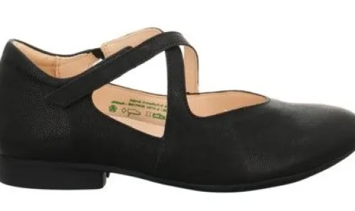 Bandschoen van Think in zwart leer met een platte hak en een kruisband over de wreef. De band is met klittenband te verstellen. De schoen is leer gevoerd. Gemaakt op de leest Guad. De voetbedden zijn uitneembaar, dus ze zijn geschikt voor uw eigen steunzool. ||Think is een merk wat uit Oostenrijk komt en bekend staat om hun eigenzinnige collectie vervaardigd uit mooie en aparte materialen. De meeste voetbedden zijn uitneembaar. Het leer wordt plantaardig gelooid. Think maakt geen wijdte maten, maar de schoenen worden vaak op een bredere leest gemaakt.