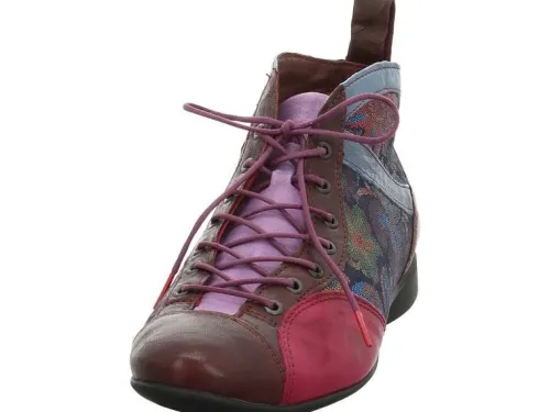 Herkenbare boot van Think in bordeaux leer met bloemen en allerlei kleuren. De boot heeft een bijna platte hak. Gemaakt op de leest Guad 2. Think maakt niet echt wijdtematen, maar is vaak geschikt voor een vollere voet. De voetbedden zijn uitneembaar, dus geschikt voor eigen steunzool. ||Think is een merk uit Oostenrijk en kenmerkt zich door aparte ontwerpen, met een prima pasvorm, gemaakt uit de beste leersoorten, die vaak plantaardig gelooid zijn.