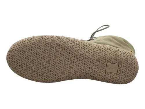 Boot van Think op een platte hak in groen suede met bruine en gele accenten. De boot is ook groen wat het milieu aangaat, waarbij de zool is gemaakt van petflessen. Gemaakt op de leest Tjub waarbij de voetbedden uitneembaar zijn. Het voorblad van de boot is glad zonder naden en aan de binnenzijde zit een rits. ||||Think komt uit Oostenrijk en staat bekend om hun aparte modellen en uitvoeringen met daarbij hoogwaardige leersoorten. Meestal zijn de voetbedden uitneembaar.