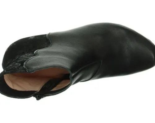 Korte laars van Think in zwart leer met aan de achterzijde een fantasieprint. De laars heeft een aparte hak die net iets hoger is waardoor de laars gekleder toont. Toch is de hak ca 3 cm hoog en comfortabel met lopen. Aan de binnenzijde zit een rits waardoor die makkelijk is aan en uit te trekken. Gemaakt op de leest Aida die zich al meer als bewezen heeft en aan veel voeten lekker zit. Think maakt niet echt wijdtematen, maar is vaak geschikt voor een vollere voet. De voetbedden zijn uitneembaar en de laars is dus geschikt voor eigen steunzool. ||Think is een merk uit Oostenrijk en kenmerkt zich door aparte ontwerpen, met een prima pasvorm, gemaakt uit de beste leersoorten, die vaak plantaardig gelooid zijn.