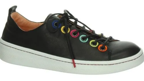 Sneaker van Think in zwart zacht leer met gekleurde veter gaatjes, wat de sneaker net wat extra’s geeft. De sneaker heeft een lange vetersluiting, waardoor die aan veel voeten past. De schoen heeft een stevig contrefort en is gemaakt op de leest Kumi. De zool is stabiel en de hak is bijna plat. De voetbedden zijn uitneembaar waardoor de schoen geschikt is voor een eigen steunzool. ||Think is een merk wat uit Oostenrijk komt en bekend staat om hun eigenzinnige collectie vervaardigd uit mooie en aparte materialen. De meeste voetbedden zijn uitneembaar. Het leer wordt plantaardig gelooid. Think maakt geen wijdte maten, maar de schoenen worden vaak op een bredere leest gemaakt.