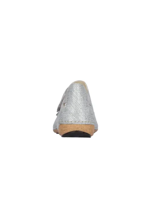 Sandaal van Waldlaufer, geschikt voor een brede voet op een brede H wijdte in ziver grijs leer met een print op de leest Heliet. De sandaal heeft een dichte hiel en op de wreef en de voorvoet is die te verstellen met een klittenband. De hak is bijna plat en de sandaal is licht van gewicht. De voetbedden zijn uitneembaar en daardoor is de sandaal geschikt voor uw eigen steunzool. ||Waldlaufer is een Duits merk. Kenmerkend is dat ze licht zijn van gewicht en zacht van leer. Er zijn verschillende wijdtematen en meestal zijn de voetbedden uitneembaar.