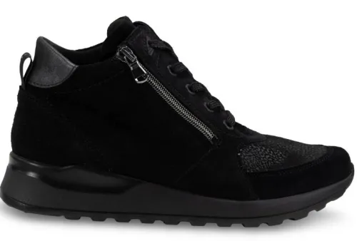 Boot van Waldlaufer op een brede H wijdte op de leest Hiroko in zwart suede met stretch materiaal gecombineerd. Aan de zijkant zit een rits waardoor die makkelijk is aan en uit te trekken. Deze boot heeft een uitneembaar voetbed en is daardoor geschikt voor uw eigen steunzool. ||Waldlaufer is een Duits merk. Kenmerkend is dat ze licht zijn van gewicht en zacht van leer. Ze maken verschillende wijdtematen en meestal zijn de voetbedden uitneembaar. Waldlaufer koop je online bij ruttenschoenen.nl