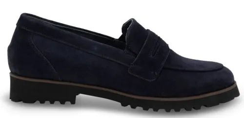 Pennyloafer van Waldlaufer op een brede H wijdte op de leest Elisa in blauw suede. Aan beiden zijkanten zit elastiek waardoor die mooi aansluit en meer mogelijkheden tot passen biedt. Deze schoen heeft een uitneembaar voetbed en is daardoor geschikt voor uw eigen steunzool. ||Waldlaufer is een Duits merk. Kenmerkend is dat ze licht zijn van gewicht en zacht van leer. Ze maken verschillende wijdtematen en meestal zijn de voetbedden uitneembaar. Waldlaufer koop je online bij ruttenschoenen.nl