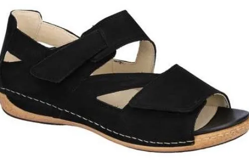 Sandaal van Waldlaufer, geschikt voor een brede voet op een brede H wijdte in zwart nubuck op de leest Heliet. De sandaal heeft een dichte hiel en op de wreef en de voorvoet is die te verstellen met een klittenband. De hak is bijna plat en de sandaal is licht van gewicht. De voetbedden zijn uitneembaar en daardoor is de sandaal geschikt voor uw eigen steunzool. ||Waldlaufer is een Duits merk. Kenmerkend is dat ze licht zijn van gewicht en zacht van leer. Er zijn verschillende wijdtematen en meestal zijn de voetbedden uitneembaar.