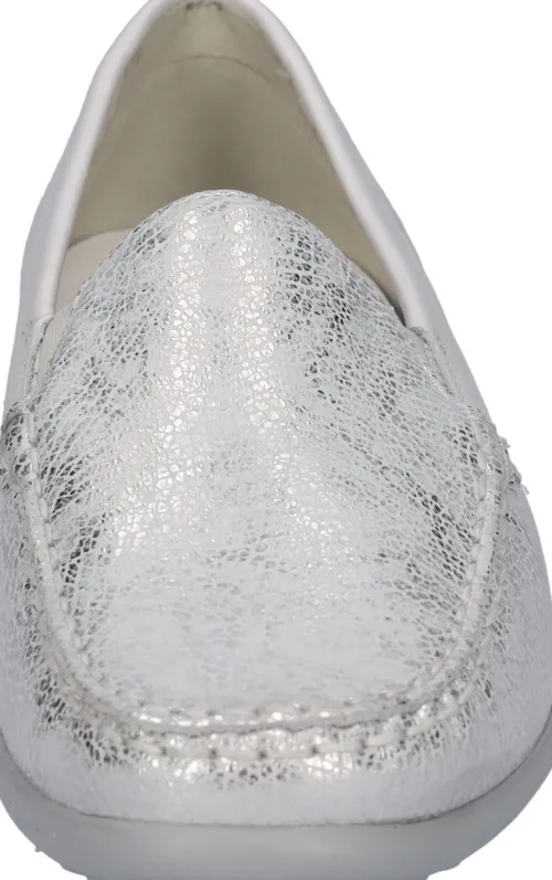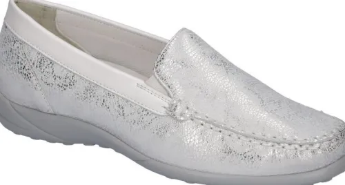 Mocasin van Waldlaufer gemaakt op een extra brede K wijdte in zilverwit nubuck met leer afgezet op de leest Klare. Aan beide zijden zit elastiek waardoor een betere sluiting. De hak is bijna plat en de schoen is licht van gewicht. De voetbedden zijn uitneembaar en daardoor is de schoen geschikt voor uw eigen steunzool. ||Waldlaufer is een Duits merk. Kenmerkend is dat ze licht zijn van gewicht en zacht van leer. Er zijn verschillende wijdtematen en meestal zijn de voetbedden uitneembaar.