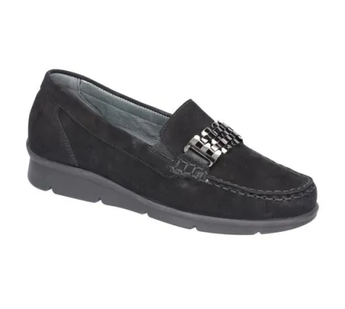 Mocassin van Waldlaufer op een extra brede K wijdte op de leest K-Inga in zwart nubuck met een sierketting. Aan de zijkant zit elastiek waardoor die beter en mooier sluit. Deze schoen heeft een uitneembaar voetbed en is daardoor geschikt voor uw eigen steunzool. ||Waldlaufer is een Duits merk. Kenmerkend is dat ze licht zijn van gewicht en zacht van leer. Ze maken verschillende wijdtematen en meestal zijn de voetbedden uitneembaar. Waldlaufer koop je online bij ruttenschoenen.nl