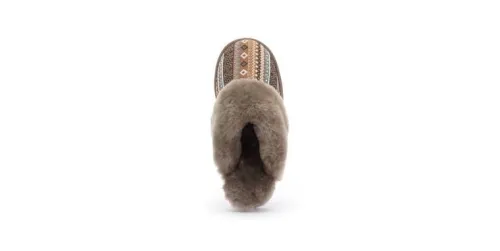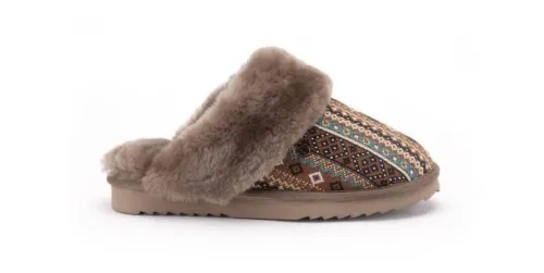 Pantoffelslipper van Warmbat gevoerd met lamsvacht in een bruin combinatie apart geweven print. De pantoffel is lekker zacht op de huid en heeft een comfortabele antislip, slijtvaste en schokdempende zool. ||||Warmbat komt uit Australie waar zij al meer dan 100 jaar wol van de merino schaap gebruiken. Er wordt 100% merino wol gebruikt wat het voordeel geeft van een goede kwaliteit en een goed ademend vermogen. De vezels kunnen tot 30% van het eigen gewicht aan vocht absorberen. ook is deze natuurlijke vacht temperatuur regulerend waardoor ze het hele jaar door zijn te dragen. Daarbij is het van natuur ook antibacterieel