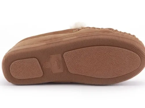 Pantoffel van Warmbat gevoerd met lamsvacht in cognac suede. Gemaakt op een mocassin maakwijze. De pantoffel is lekker zacht op de huid en heeft een comfortabele antislip, slijtvaste en schokdempende zool. ||||Warmbat komt uit Australie waar zij al meer dan 100 jaar wol van de merino schaap gebruiken. Er wordt 100% merino wol gebruikt wat het voordeel geeft van een goede kwaliteit en een goed ademend vermogen. De vezels kunnen tot 30% van het eigen gewicht aan vocht absorberen. ook is deze natuurlijke vacht temperatuur regulerend waardoor ze het hele jaar door zijn te dragen. Daarbij is het van natuur ook antibacterieel