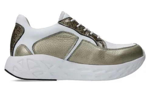 Sneaker van Wolky in goudkleurig met wit leer op de leest Pro, dit is een brede ronde leest die veel ruimte bij de tenen heeft. De schoen is verstelbaar met een veter en aan de binnenzijde zit een rits waardoor die makkelijk aan en uit te trekken is. Deze schoen is licht van gewicht en biedt veel comfort en heeft een comfortabele dikke zool die extra helpt bij het afwikkelen. De voetbedden zijn uitneembaar en ze zijn dus geschikt voor uw eigen steunzool. ||Wolky is een Nederlands merk, wat grotendeels in Portugal geproduceerd wordt. Ze hebben vaak een wat bredere leest en bieden ook vaak goed ruimte bij de tenen. Kenmerkend zijn de zachte zolen waarop u verend loopt. Het lopen op wolken effect. Wolky wordt dan ook vaak als zeer comfortabel ervaren. Ze hebben vaak een wat bredere leest en bieden ook vaak goed ruimte bij de tenen.