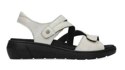 Sandaal van Wolky met een bijna platte sleehak in offwhite leer gemaakt op de leest Terra. De sandaal is op de voorvoet, en op de de wreef met klittenband te verstellen en heeft een zacht uitneembaar voetbed. De zigzag band bij de wreef maakt de sandaal af. ||Wolky is een Nederlands merk, wat grotendeels in Portugal geproduceerd wordt. Kenmerkend zijn de zachte zolen waarop u verend loopt. Het lopen op wolken effect. Wolky koopt u online bij Ruttenschoenen.nl