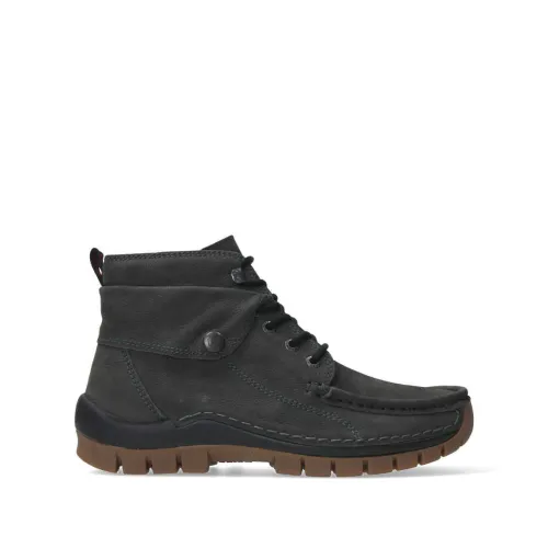 Boot van Wolky in grijs nubuck in combinatie met een donkere zool. De boot is verstelbaar met een veter. Geschikt voor uw eigen steunzool. Op de leest Up2 De boot heeft een mocassin naad over de voet, is zeer comfortabel en heeft een platte hak van ca 25mm en een profiel zool. De boot heeft een teruggeslagen sierklepje. ||Wolky is een Nederlands merk, wat grotendeels in Portugal geproduceerd wordt. Ze hebben vaak een wat bredere leest en bieden ook vaak goed ruimte bij de tenen. Kenmerkend zijn de zachte zolen waarop u verend loopt. Het lopen op wolken effect. Wolky wordt dan ook vaak als zeer comfortabel ervaren. Wolky koop je online bij ruttenschoenen.nl