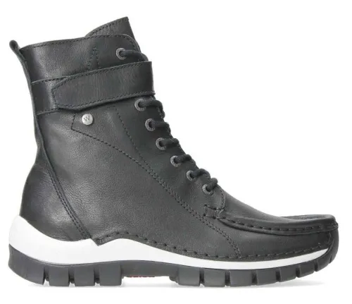 Boot van Wolky die wat hoger om het been sluiten in zwart leer in combinatie met een witte rand bij de zool. De boot is verstelbaar met een veter. Geschikt voor uw eigen steunzool. Op de leest Up2 De boot heeft een mocassin naad over de voet, is zeer comfortabel en heeft een platte hak van ca 25mm en een profiel zool. De boot heeft een klittenband over de enkel. ||Wolky is een Nederlands merk, wat grotendeels in Portugal geproduceerd wordt. Ze hebben vaak een wat bredere leest en bieden ook vaak goed ruimte bij de tenen. Kenmerkend zijn de zachte zolen waarop u verend loopt. Het lopen op wolken effect. Wolky wordt dan ook vaak als zeer comfortabel ervaren. Wolky koop je online bij ruttenschoenen.nl