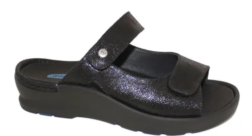 Slipper van Wolky die te verstellen is met 2 klittenbanden in zwart nubuck met een glans print. De voetbedden zijn stevig maar ook zacht met lopen en te vervangen voor uw eigen steunzolen. De loopzool heeft een profiel en de hak is bijna plat. De slipper is gemaakt op de leest Dutch.