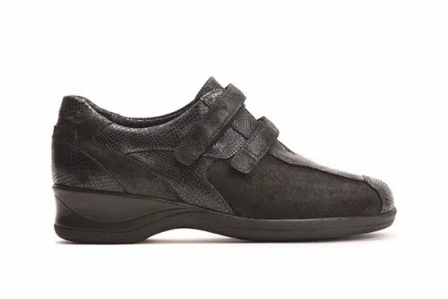 Klittenbandschoen van Xsensible, verstelbaar met klittenband in zwart leer met een croco print en nubuck inzet waarin stretch verwerkt is. De schoen heeft een lage hak ca 2½ cm. Het voetbed is uitneembaar, dus prima voor uw eigen steunzool. Op een brede H wijdte. ||De gepatenteerde stretch leer technologie Xsensible inside® bestaat uit verschillende lagen en elke laag heeft een specifieke functie. De buitenste laag is gemaakt van echt leer en heeft een speciale behandeling ondergaan waardoor het beschikt over een verbazingwekkende elasticiteit. Het stretch leer zorgt voor een maximale bewegingsvrijheid. Alle Xsensible schoenen voelen aan als een tweede huid, ze zijn verkrijgbaar in verschillende wijdtematen. Xsensible schoenen zijn ook geschikt voor mensen met gevoelige voeten.