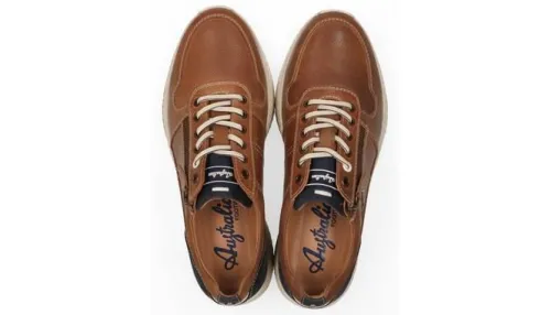 Sneakers van Australian op een wijdte G 1/2 in cognac leer met blauw suede bij de hiel. De schoen heeft bij de enkel een postering en een fijn voetbed dat uitneembaar is, waardoor die ook geschikt is voor een eigen steunzool. ||De roots van Australian liggen in 1945 en is begonnen met het tennis segment. Op zoek naar een sterke naam koos men voor Australian omdat de Australische tennissers destijds de ranglijsten aanvoerden. De schoenen van Australian kenmerken zich door stoere en casual heren schoenen. De materiaalkeuze en het spelen met accenten blijkt een belangrijke inspiratiebron. Australian biedt een complete collectie, die inspeelt op de modische trends, maar de klassiekers niet vergeet. Wij verkopen Australian vanaf maat 39 t/m maat 50.(uiteraard zolang de voorraad strekt) Australian koopt u online bij Ruttenschoenen.nl