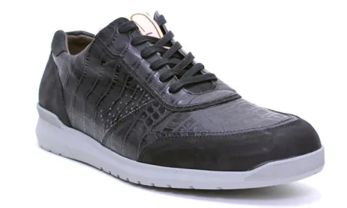 Sneaker van Gijs in zwart nubuck in combinatie met leer met een croco prent. Op een smalle E wijdte op de leest 202 met een uitneembaar voetbed, dus geschikt voor eigen steunzool. Vervaardigd uit kalfsleer met rubberzool met PU vulling voor meer demping en een lager gewicht. Deze leest biedt meer ruimte voor de 3e en 4e teen en heeft een extra teensprong, waardoor het lopen makkelijker wordt. ||Gijs komt uit de koker van Durea en staat dus garant voor een goede kwaliteit en pasvorm. Jaren van ervaren ouderwetse vakmanschap ligt hieraan ten grondslag. Inmiddels al een aantal seizoenen verkrijgbaar verovert het zo zijn eigen plekje. Gijs koop je online bij Ruttenschoenen.nl
